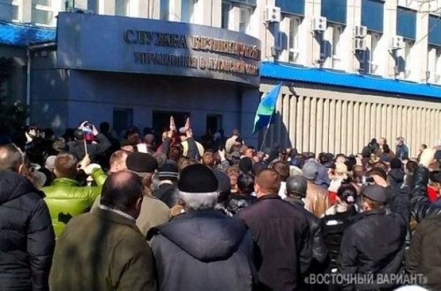 Учасники проросійського мітингу взяли штурмом будівлю управління СБУ в Луганській області, вибивши двері, після чого пробралися на другий поверх і почали трощити вікна.