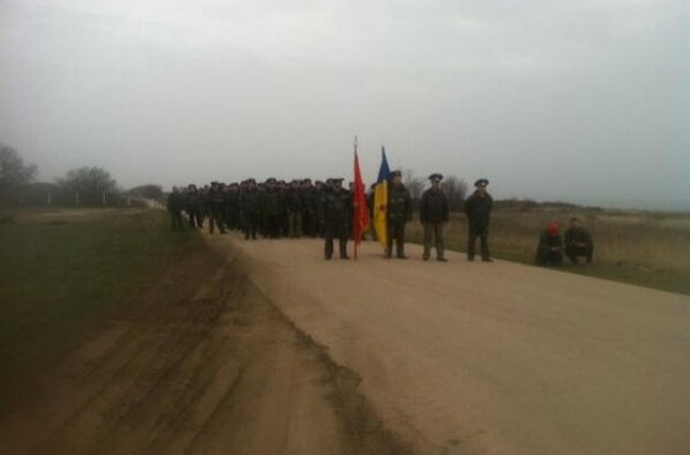 Нагадаємо, вранці у вівторок 50 українських військових прийшли без зброї на аеродром Бельбек з вимогою до озброєних людей без розпізнавальних знаків пустити їх на позиції. Попереду колони українські військові несли два прапори - український та прапор частини, який не змінювався з радянських часів.