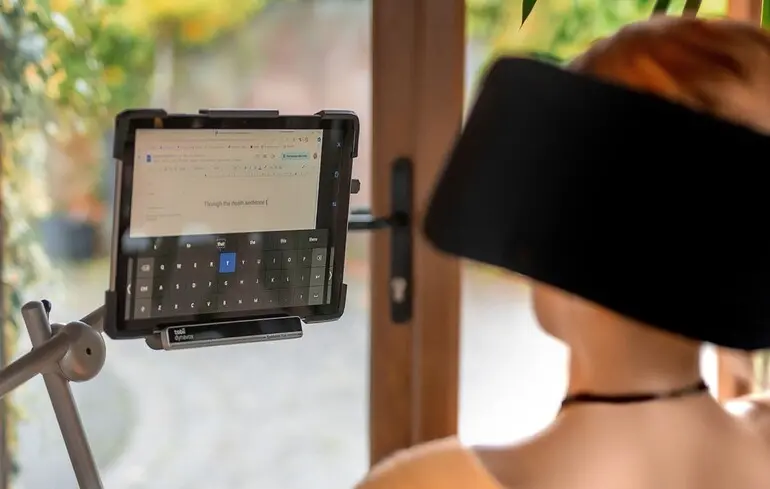 — Пристрій з’явився в мене восени 2020-го. Коштував він близько 3000 євро. Замовили й привезли знайомі. Називається eye-tracker — тоненька смужка під монітором, яка відстежує рух зіниць. Я використовую Tobii Dynavox Eye Gaze: інфрачервоні сенсори під екраном світять в очі, камера фіксує відблиски на рогівці й зіниці, алгоритм перетворює це на курсор і «клік».