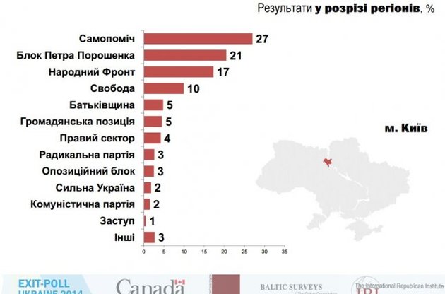 Згідно з результатами Міжнародного екзит-полу, проведеного групою "Рейтинг", за "Самопоміч" проголосувало 27% киян. Слід зазначити, що навіть на заході України Самопоміч отримала набагато менше підтримки виборців - всього 16%, і тим самим посіла лише третє місце.