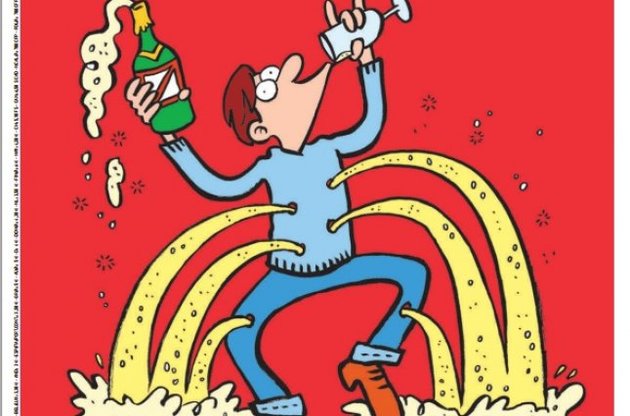 На обкладинці молодий чоловік п'є шампанське, яке виливається через рани на його тілі. На малюнку написано "У них є зброя. Нам плювати. У нас є шампанське".