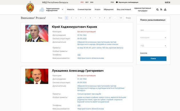 В описах осіб на сайті МВС - Олександра Лукашенка і глави відомства Юрія Караєва, значиться звинувачення «у військових злочинах проти білоруського народу». Крім того, Олександра Лукашенко звинувачують в узурпації влади в республіці, а Караєва називають «озброєним і дуже небезпечним».