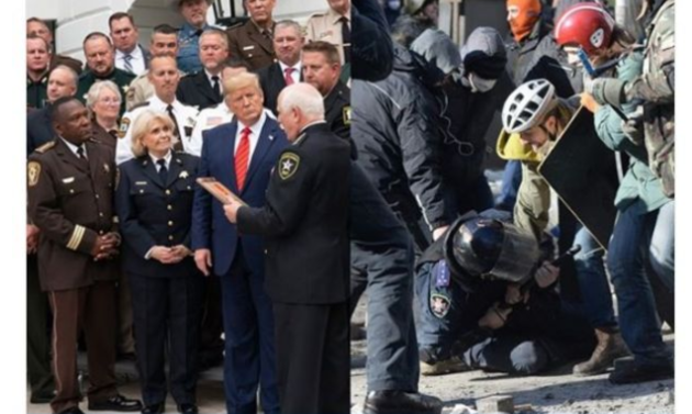 Як повідомляє BBC, у Facebook з'явилася політична реклама з двох знімків: на одному Трамп в спокійній атмосфері зустрічається з поліцейськими, а на іншій група демонстрантів бореться з правоохоронцем в захисній касці.