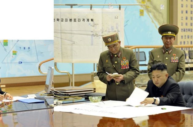 Компрометуючі фотографії опублікувало Центральне телеграфне агентство Кореї (ЦТАК) як ілюстрації до статті про те, що північнокорейський лідер віддав наказ підготувати стратегічні ракети, націлені на США і Південну Корею. На фото видно, як Кім Чен Ин з керівниками Генштабу обговорює план нападу на своїх супротивників, які зараз саме проводять спільні військові навчання. Про це свідчать географічні карти на стіні з позначками про траєкторії ударів і загрозливими написами (мал. 2-4).