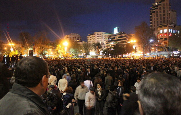 "Ми закликаємо всіх вас зібратися тут. Ми не згодні з рішенням. Нашу батьківщину віддають ворогові. Нікол, ти ворог народу, зрадник", - заявив один з учасників акції протесту, передає «Інтерфакс-Україна».