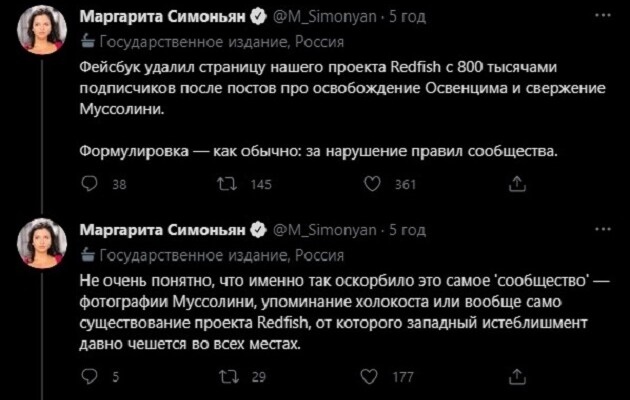 «Фейсбук видалив сторінку нашого проекту Redfish з 800 тисячами підписників після постів про звільнення Освенцима і повалення Муссоліні. Формулювання - як зазвичай: за порушення правил спільноти», - обурюється рупор Кремля.