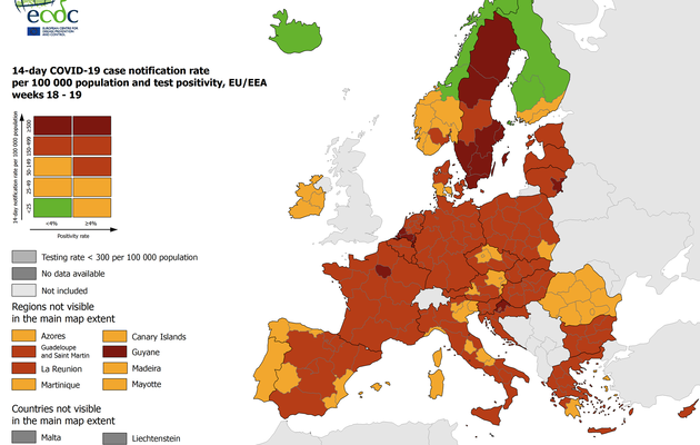 За Швецією з показником захворюваності 577.38 на 100 тисяч населення за останні 14 днів, на другому місці - Литва (562.83), за якою слідують Кіпр (521.84), Нідерланди (483.09) і Латвія (431.31). Для інших країн показник захворюваності менше 300.
