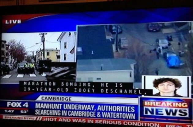 На телеканалі у прямому ефірі йшов репортаж про те, що поліція Бостона веде пошуки 3, одного з підозрюваних у теракті. Однак замість імені Царнаєва в субтитрах на екрані з'явилося ім'я голлівудської актриси: "Марафонський підривник 19-річна Зоуї Дешанель".