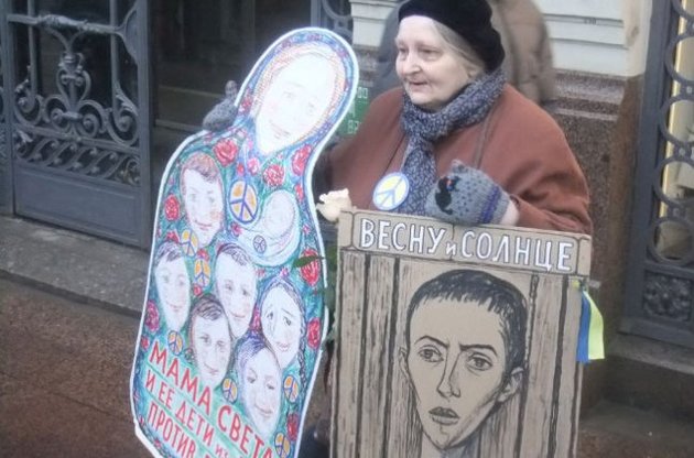 У ході акції активісти взялися за руки на знак підтримки Савченко. В однієї з жінок був український прапор.