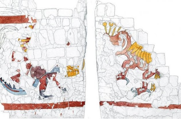 Фрески з зображеннями ігуаноподібної істоти (ліворуч) і монстра з рисами равлики та кішки (фото Lisa Trever/University of California Berkeley).