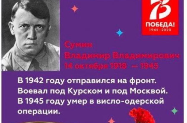 В Челябінську торговий центр "Космос" помилково опублікував фотографію Адольфа Гітлера як учасника Другої світової війни в межах патріотичного конкурсу "Імена героїв", присвяченого до 75-річчю Дня перемоги, передає "Дождь".