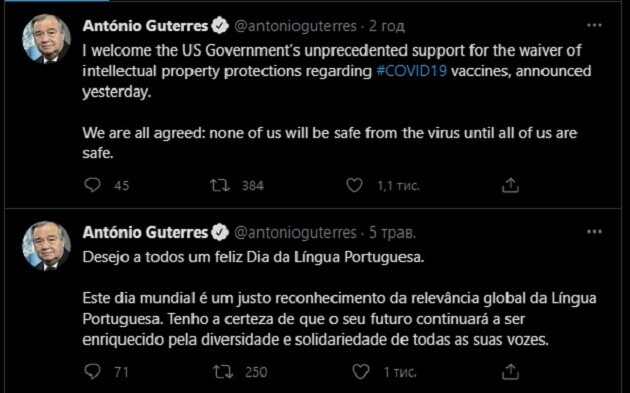 «Я вітаю безпрецедентне рішення адміністрації США у випадку з вакцинами від COVID-19 зробити виняток з правила про захист інтелектуальної власності. Ми всі згодні, що ніхто не буде захищений від вірусу, поки захист не отримають всі »- написав Гутерріш.