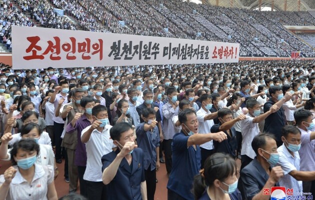 На фотографіях, опублікованих державними ЗМІ, видно стадіон, переповнений людьми з плакатами з написами «Весь материк США в межах нашого обстрілу» та «Імперіалістичні США є руйнівниками миру», передає Reuters.