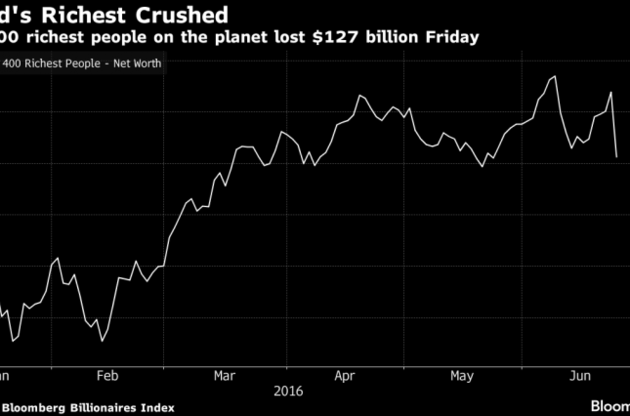 За підсумками біржових торгів у п'ятницю, 24 червня, 400 найбагатших людей світу загалом втратили 127,4 мільярдів доларів - 3,2% від свого сукупного стану в 3,9 трлн доларів.