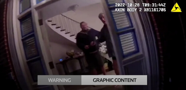 На кадрі з боді-камери двоє поліцейських стукають у двері дому Пелосі. Коли вони відчиняються, можна побачити, як Пелосі та Депейп стоять поряд, а потім останній задіює великий молоток.