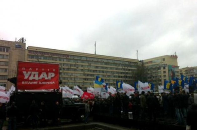 На постаменті біля пам'ятника Лесі Українці перед мітингувальниками виступили представники "Батьківщини", УДАР та "Свободи", зокрема, кандидати в депутати по мажоритарних округах № 223 і № 215 Юрій Левченко та Андрій Іллєнко.