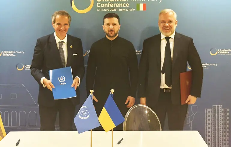 У Римі підписано нову угоду МАГАТЕ з Міненерго. Її підписали за присутності президента України Володимира Зеленського міністр енергетики України Герман Галущенко і генеральний директор МАГАТЕ Рафаель Гроссі.