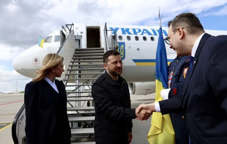 Президент Володимир Зеленський прибув до Чехії разом з першою леді Оленою. Їх в аеропорту зустрів міністр закордонних справ Ян Ліпавський.