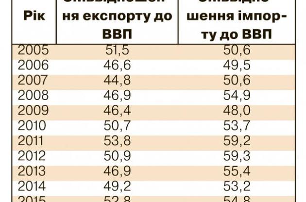 Нині економіка нашої країни класифікується як "мала відкрита економіка". Чому мала? Тому що, наприклад, у 2015–2016 рр. частка українського ВВП у загальносвітовому становила лише 0,123% (за даними 3, ВВП України в 2015 р. - 90,9 млрд дол., у 2016-му - 93,3 млрд). Чому відкрита? Тому що Україна експортує та імпортує досить значну частку товарів і послуг. Щоб переконатися в цьому, досить подивитися табл. 1.