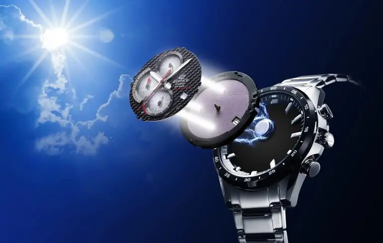 В основі сонячного годинника лежить мініатюрна сонячна панель, вбудована в циферблат або під ним. Вона сприймає природне чи штучне світло і перетворює його на електрику. Далі енергія проходить в батарею, що перезаряджається (акумулятор), яка забезпечує роботу механізму. Це схоже на звичайний кварцовий принцип, але без потреби регулярної заміни традиційних батарейок.