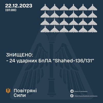 У ніч проти 22 грудня росіяни атакували Україну, застосувавши 28 ударних безпілотників типу Shahed з районів Курськ, Приморсько-Ахтарськ – РФ, Чауда – Крим.