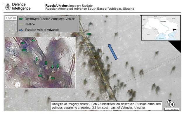«На знімках видно зосереджені втрати російської техніки на вугледарському напрямку Донецької області. Ймовірно, ці машини входили до складу 155-ї російської морської піхотної бригади, яка була на передовій останніх дорогих наступальних операцій», – йдеться у повідомленні британської розвідки.