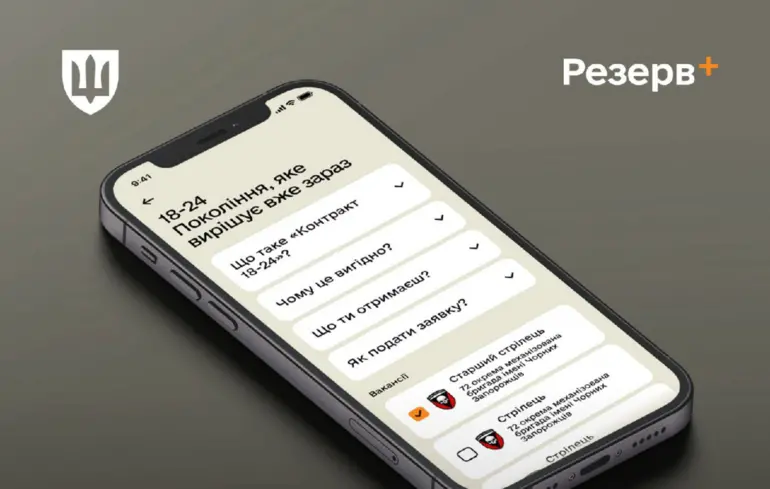 У Міністерстві оборони повідомили, що вийшла оновлена версія застосунку "Резерв+". Це пов'язано з початком проєкту "Контракт 18-24". Тепер у додатку з'явилася можливість подати заявку на укладання однорічного контракту з ЗСУ для людей, яким ще не виповнилося 25 років.