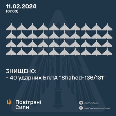 В результаті бойової роботи знищено 40 «шахедів» противника у межах Київської, Вінницької, Житомирської, Кіровоградської, Миколаївської, Черкаської, Одеської, Дніпропетровської та Херсонської областей.