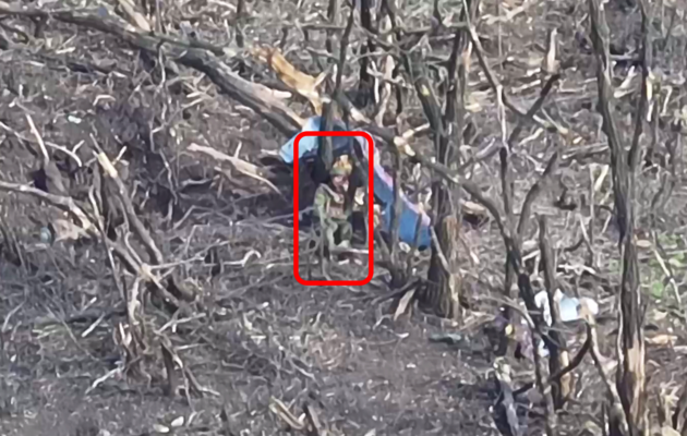 Українські військові за допомогою FPV-дрона знищили російського окупанта, який намагався заховатися серед випалених дерев.