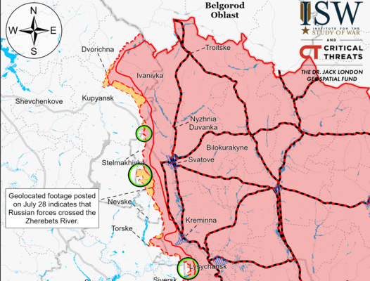 Українські війська 30 липня продовжували наступальні дії в районі Бахмута і не досягли підтверджених успіхів. Українські військові джерела повідомили, що українські війська досягають невеликих, але постійних успіхів на південному фланзі Бахмуту і що російські сили продовжують стягувати резерви в цей район.