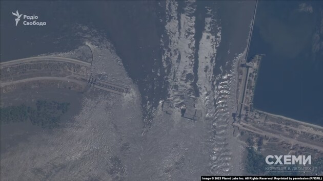 Вдень вівторка "Схеми" опублікували перший супутниковий знімок Planet Labs Каховської станції після того, як її підірвала армія Росії.