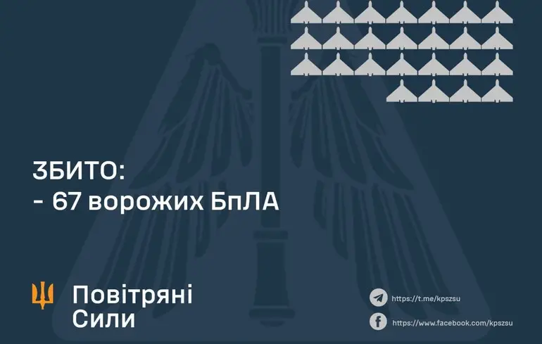 Станом на 09.00 підтверджено збиття 67-ми ударних БпЛА типу Shahed та безпілотників інших типів у Київській, Харківській, Полтавській, Сумській, Черкаській, Чернігівській, Кіровоградській, Вінницькій, Житомирській, Хмельницькій, Запорізькій, Дніпропетровській, Донецькій та Одеській областях.