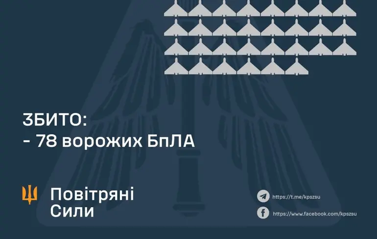 Станом на 09.00 підтверджено збиття 78-ми ударних БпЛА типу Shahed та безпілотників інших типів у Полтавській, Сумській, Харківській, Черкаській, Чернігівській, Київській, Дніпропетровській, Миколаївській, Запорізькій, Житомирській, Хмельницькій та Донецькій областях.