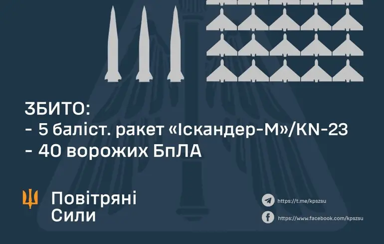 В результаті бойової роботи протиповітряна оборона збила усі п’ять балістичних ракет «Іскандер-М»/KN-23, які російські злочинці спрямували по Києву.