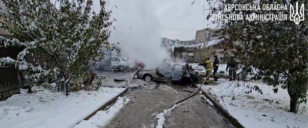 «Спалені вщент автівки, побитий уламками житловий будинок. Так зараз виглядає стоянка транспортного підприємства у Херсоні, яку окупаційні війська вкрили вогнем близько 09:00. Травми, несумісні з життям, отримали двоє водіїв», – зазначили в ОВА.