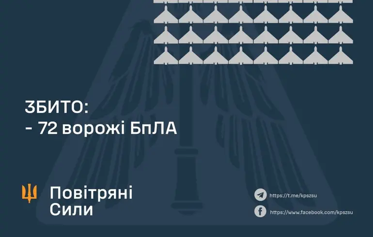 Станом на 09.00 підтверджено збиття 72-х ударних БпЛА типу Shahed та безпілотників інших типів у Полтавській, Сумській, Харківській, Черкаській, Чернігівській, Київській, Житомирській, Хмельницькій, Вінницькій, Кіровоградській, Дніпропетровській, Донецькій, Миколаївській, Одеській, Запорізькій та Рівненській областях.