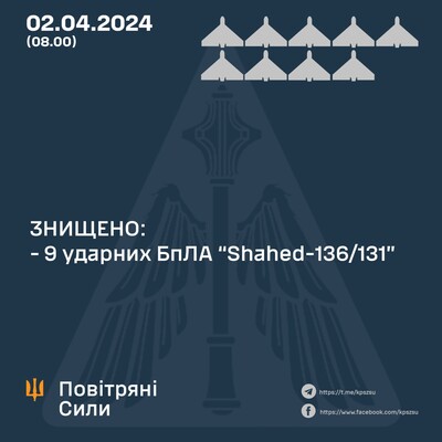 В ніч проти 2 квітня росіяни атакували Україну керованою авіаційною ракетою Х-59 із повітряного простору тимчасово окупованих територій Запорізької області, а також десятьма ударними безпілотниками із мису Чауда ( тимчасово окупований Крим). Про це повідомив у Telegram командувач Повітряних Сил Збройних Сил України генерал-лейтенант Микола Олещук.