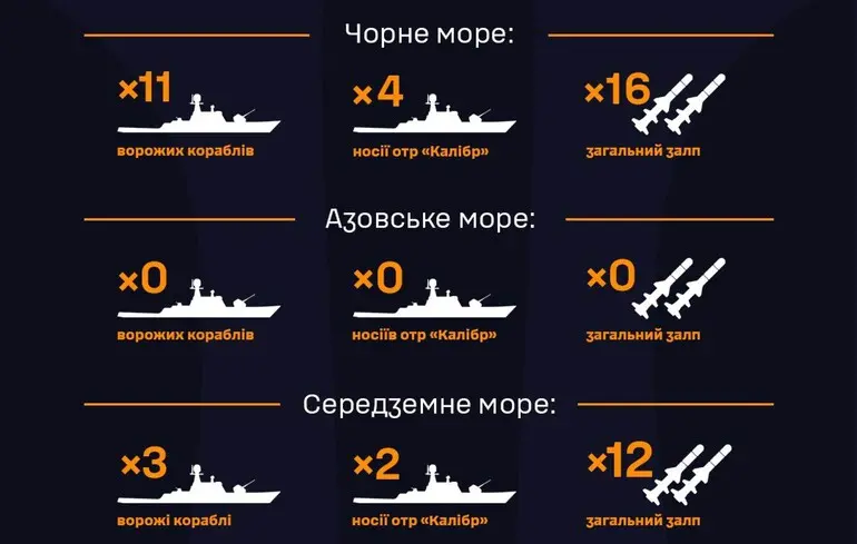 Тим часом в Середземному морі зафіксовано три ворожі кораблі, з яких два є носіями крилатих ракет "Калібр" загальним залпом до 12 ракет.