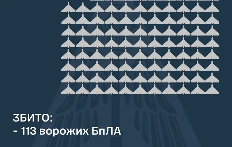 Станом на 08.00 підтверджено збиття 113-ти ударних БпЛА типу Shahed та безпілотників інших типів у Харківській, Полтавській, Сумській, Київській, Чернігівській, Черкаській, Кіровоградській, Хмельницькій, Миколаївській, Одеській, Херсонській та Дніпропетровській областях.