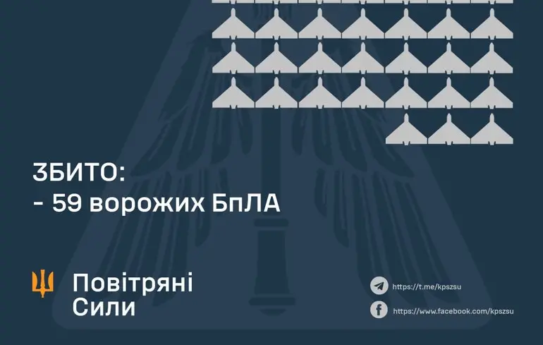 Станом на 09.00 підтверджено збиття 59-х ударних БпЛА типу Shahed та безпілотників інших типів у Харківській, Полтавській, Сумській, Київській, Чернігівській, Черкаській, Кіровоградській, Житомирській, Хмельницькій, Дніпропетровській, Миколаївській та Одеській областях.