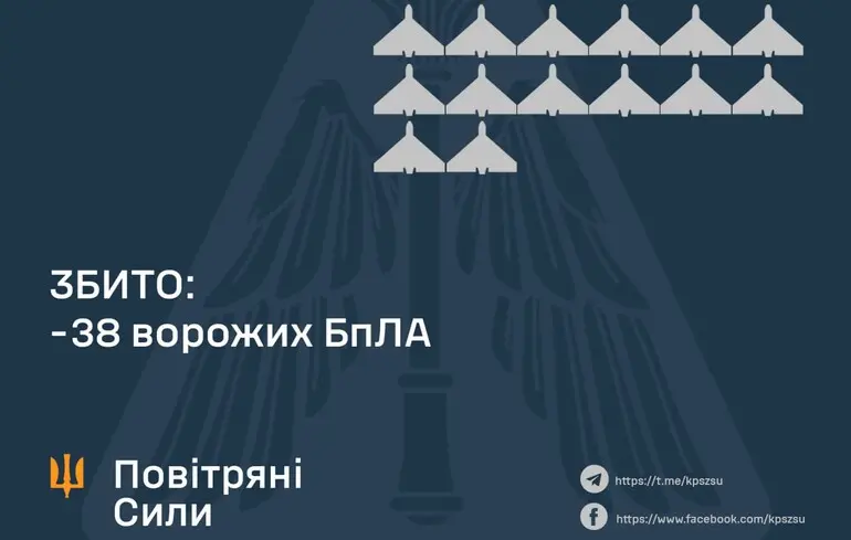 Станом на 09.00 підтверджено збиття 38 ударних БпЛА типу Shahed та безпілотників інших типів на сході, півночі, півдні та в центрі країни.