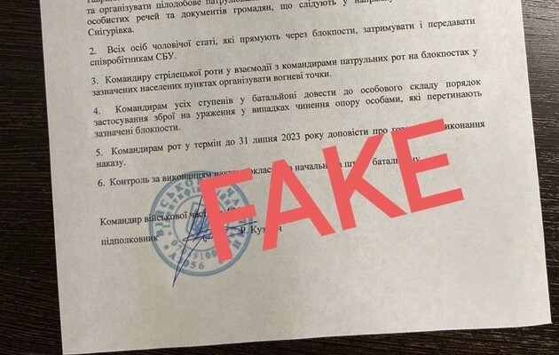 Російські пропагандистські ресурси знову поширюють фейки про Україну. Цього разу вони опублікували фото несправжнього документу, в якому командир однієї з частин Нацгвардії нібито наказує військовим «застосовувати зброю на ураження» на блокпостах. Також у цьому «документі» йдеться про організацію цілодобового патрулювання та «вогневих точок з метою виявлення ухилянтів від мобілізації та українських військових, які самовільно покинули бойові позиції».