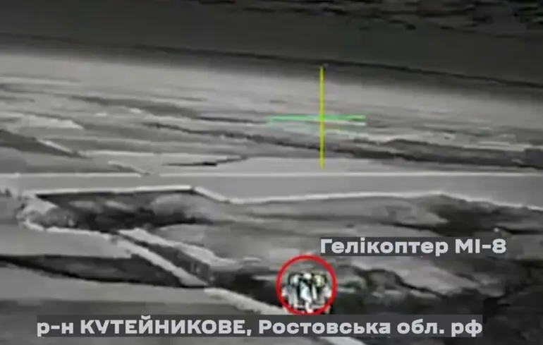 Збиття, за даними військових, відбулося над селом Кутейникове в Ростовській області. На оприлюднених кадрах зазначено, що гелікоптер збили далекобійним дроном FP-1.
