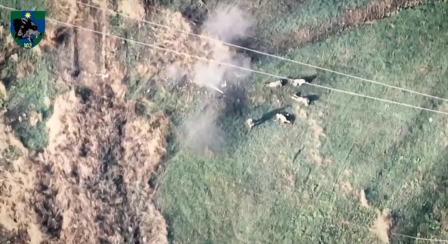 "Від FPV-дрона серії "Шкода" 108 бригади ТРО російські військовослужбовці, що тягнули пораненого, розлетілися, як кеглі, - підписав Бутусов відео, яке опублікував на своєму Tg-каналі. - Кадри знято на запорізькому напрямку фронту".