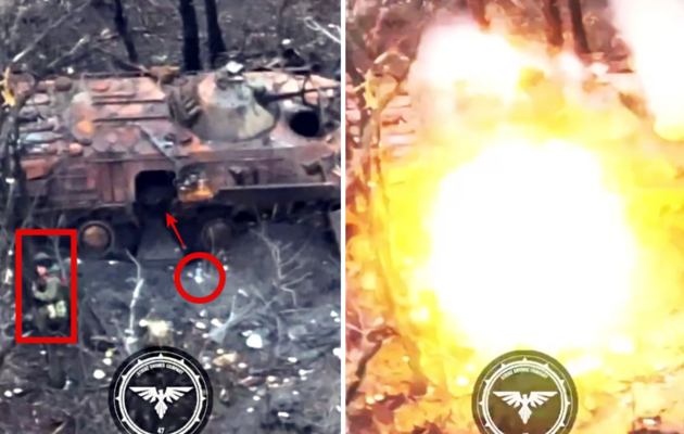 Нещодавно у 47 ОМБР показали, як російські танки та бронетранспортери з десантом намагалися прорватися до позицій українських військових. Частину техніки воїни ЗСУ знищили артилерійськими ударами, а ще низка підірвалася на мінах. Наприкінці російську піхоту разом із бронетехнікою накрили касетними снарядами, внаслідок прямого влучання яких ворожі БТР влаштували «феєрверк».