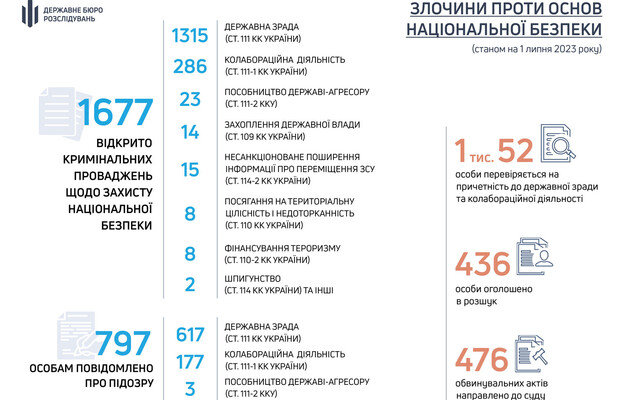 Державне бюро розслідувань повідомляє, що від початку повномасштабного вторгнення Росії правоохоронці відкрили 1 677 кримінальних справ стосовно злочинів проти безпеки нашої держави.