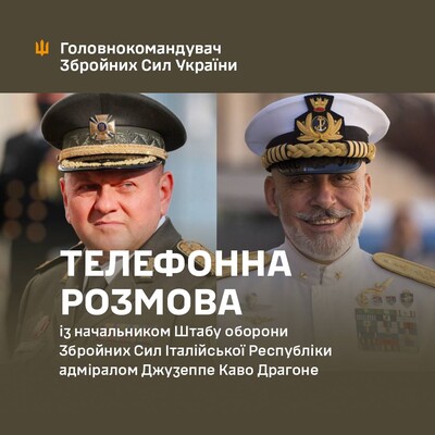 Головнокомандувач ЗСУ Валерій Залужний 15 січня провів розмову з начальником Штабу оборони Збройних сил Італії адміралом Джузеппе Каво Драгоне.