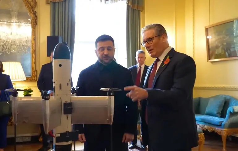 У п’ятницю, 24 жовтня, президент України Володимир Зеленський під час офіційного візиту до Великої Британії продемонстрував український дрон-перехоплювач OCTOPUS, який розробили українські військові разом з британськими вченими. Про це повідомляється у його Telegram-каналі.