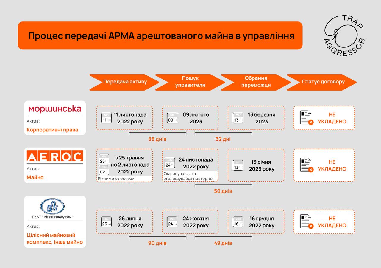 З наведеної інфографіки можна зробити висновок, що АРМА працює однаково, а саме — завжди неефективно, і це стосується не лише активів «Моршинської». Проведені конкурси не мають будь-якого кінцевого результату, адже договорів на управління досі не укладено, відповідно, збереження майна не здійснюється. Тому актив псується, розкрадається чи продовжує працювати на власника, що особливо дивно, коли це репрезентанти країни-агресорки.