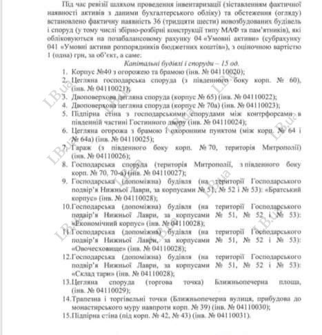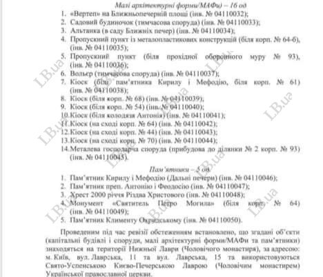 Аудитори також з’ясували, що керівництво Чоловічого монастиря УПЦ МП знищило одну з пам’яток архітектури Лаври – старовинну огорожу на вулиці Ближньопечерській. Було зафіксовано й факти незаконної передачі об’єктів культурної спадщини в користування Київській метрополії, Приватній академії та Академії УПЦ.